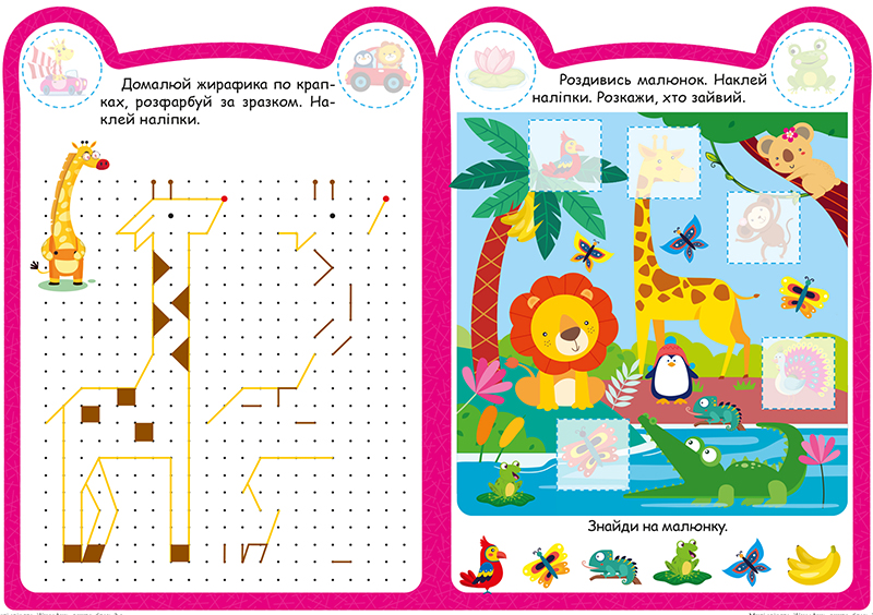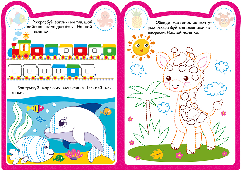 Ці книжки для допитливих, активних і кмітливих малюків. Вони містять творчі завдання, виконання яких допоможе розвинути просторове та логічне мислення, фантазію й увагу дітлахів. Яскраві ілюстрації та наліпки сприятимуть формуванню естетичного смаку та уяви.