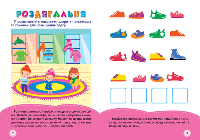 Ця книга містить вправи для розвитку вашої дитини. Виконання цікавих завдань із використанням наліпок сприяє тренуванню пам’яті, уваги, логіки, а також розвитку дрібної моторики, мовлення та математичних здібностей. Посібник призначений для спільних занять дорослого й дитини.