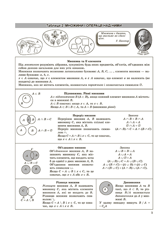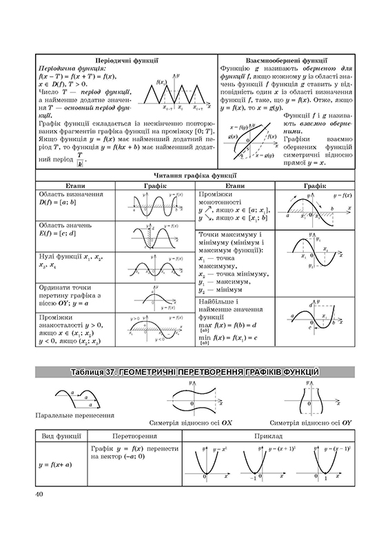 У даному посібнику в зручній формі (у вигляді таблиць і схем) викладено основні поняття алгебри та початків аналізу, вивчення яких передбачено чинною шкільною програмою.