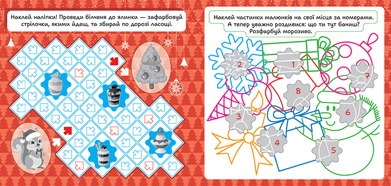 Ця книга запрошуює маленьких читачів поринути в казковий світ передсвяткових пригод. Разом із веселими й кмітливими персонажами діти виконуватимуть цікаві завдання для розвитку логіки, уваги і пам’яті. Яскраві, барвисті ілюстрації, що доповнюються інтерактивними наліпками, спонукатимуть малюків до застосування просторового й образного мислення.