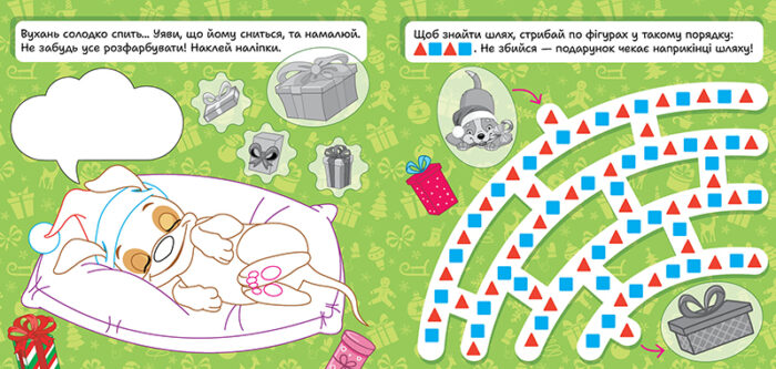 Ця книга запрошуює маленьких читачів поринути в казковий світ передсвяткових пригод. Разом із веселими й кмітливими персонажами діти виконуватимуть цікаві завдання для розвитку логіки, уваги і пам’яті. Яскраві, барвисті ілюстрації, що доповнюються інтерактивними наліпками, спонукатимуть малюків до застосування просторового й образного мислення.